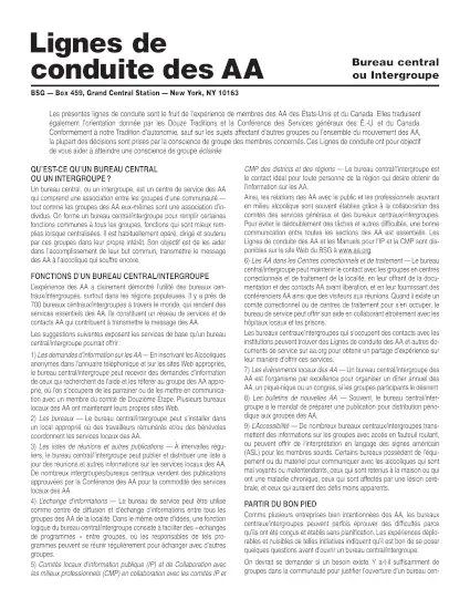 La experiencia de A.A. ha demostrado claramente la utilidad de las oficinas centrales/intergrupales, especialmente en zonas densamente pobladas. Existen casi 700 oficinas centrales/intergrupales en todo el mundo que prestan servicios esenciales de A.A. Forman una red de servicios y contactos de A.A. que ayudan a difundir el mensaje de A.A.